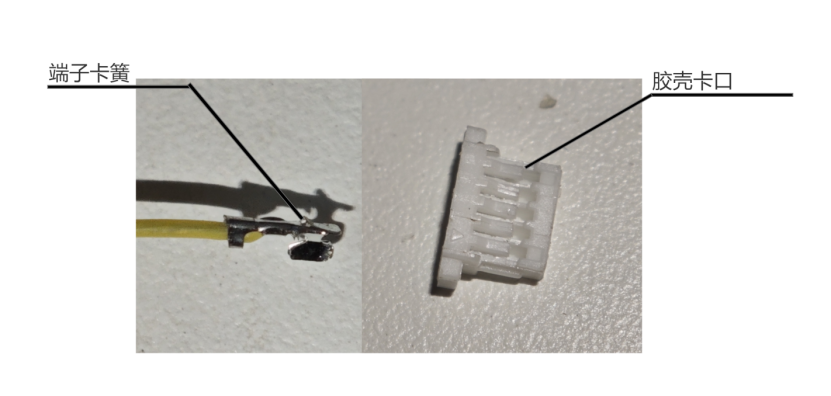 如图所示,金属端子上有一个端子卡簧,胶壳内部对应位置有一个胶壳卡口。安装时,需要让端子卡簧朝向胶壳卡口,插入后卡簧会弹起并卡住胶壳,从而固定端子。
